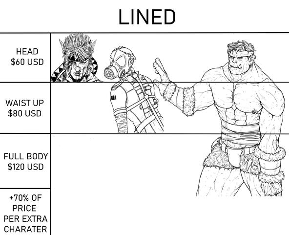 Extra information:Lined commissions can be done with 2 types of lines. Rough like in the first two figures, or soft like in the last figure.I will always use rough lines unless specified otherwise.