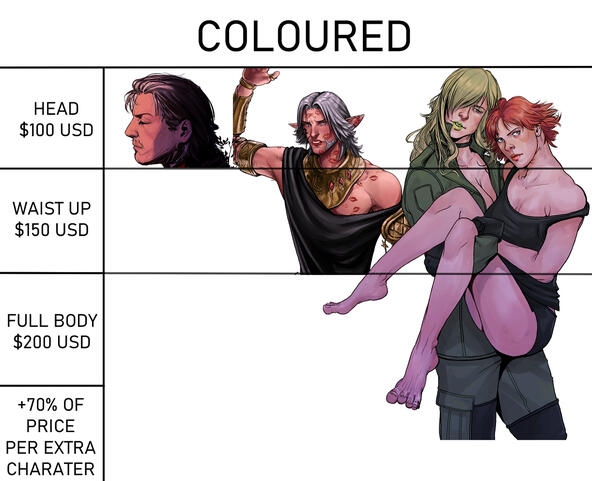 Extra information:Colouring can vary slightly as I experiment in personal art and have no set style. If you want a specific style of colouring please refer to the images on the portfolio page and show me the type you want.If you do not want a certain style then I will use the style in the picture above automatically.