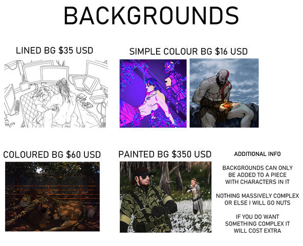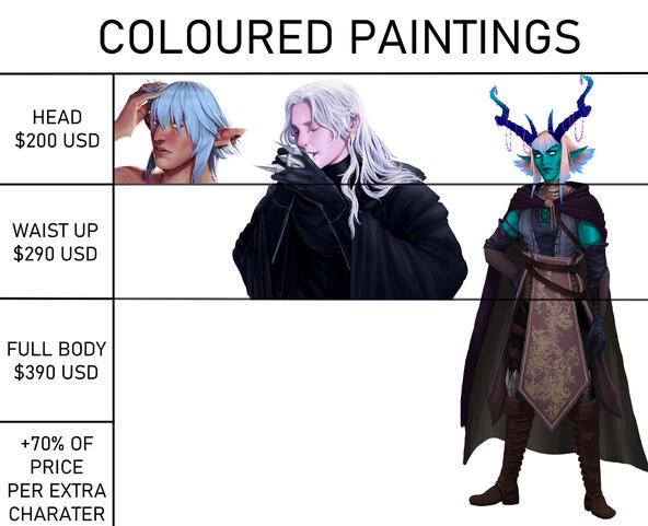 Please make sure you have read my terms of service before you commission me.Below are the prices, basic examples, and basic styles for digital art commissions.If you are having trouble seeing the images below clearly here is a link to higher quality images
